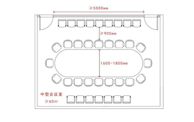 6.4.4 中型會議室面積不宜小于60㎡、可供15~50人會議;中型會議室的會議桌桌面尺寸為1.6m~1.8m;桌子高度0.75m~0.8m;如該辦公室位于高層建筑的內(nèi),依據(jù)《高層民用建筑設(shè)計防火規(guī)范》規(guī)定,達到60平方的獨立開間需設(shè)計兩個以上的安全疏散出口,其相鄰兩個安全出口最近邊緣的水平距離不應(yīng)小于5m。