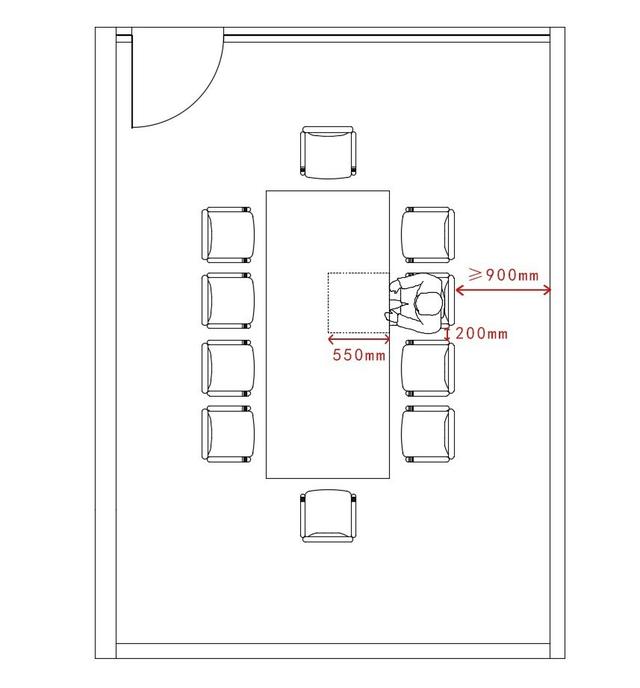 6.4.6 單個空間尺寸 :椅子左右分隔尺寸宜為0.2m,會議桌的活動范圍為0.5m,椅子與墻面的中間過道不應(yīng)少0.9m。